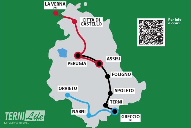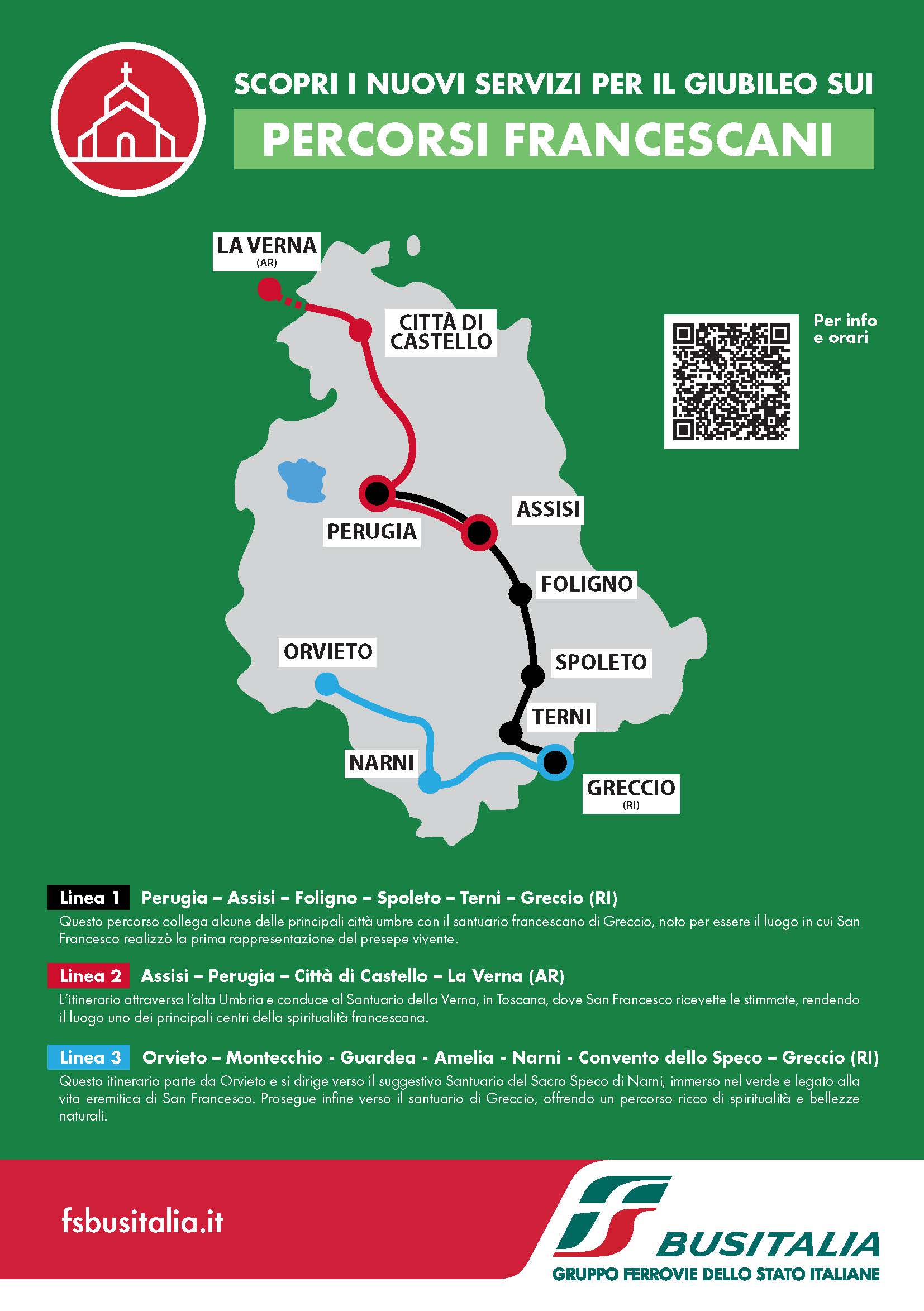 - Linea 1: Perugia – Assisi – Foligno – Spoleto – Terni – Greccio (Ri): collega alcune delle principali città umbre al Santuario di Greccio, luogo in cui San Francesco realizzò la prima rappresentazione del presepe vivente;