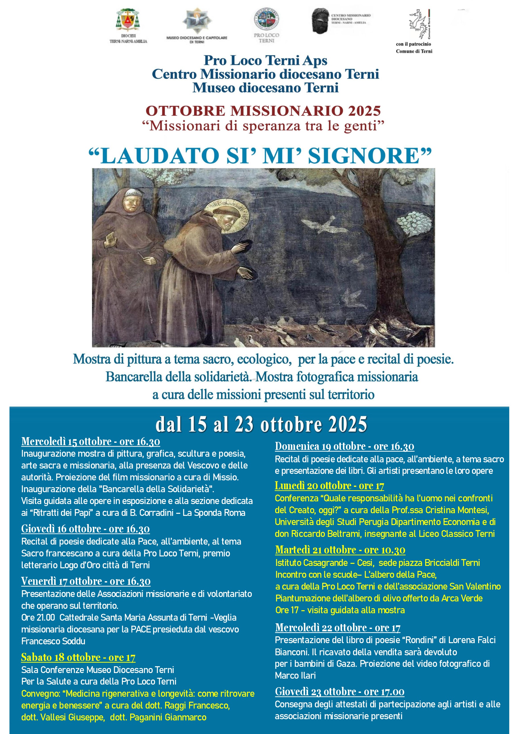 “Laudato si’ mi’ Signore” è la mostra fotografica e documentaria missionaria, di pittura, grafica, scultura allestita dal 15 al 23 ottobre presso le sale espositive del Museo diocesano di Terni. La mostra, dedicata alle missioni, alla pace, al tema sacro ed ecologico, è promossa dal Centro Missionario della diocesi, dalla Pro Loco Terni aps, con il contributo del Museo diocesano di Terni, dell’Accademia La Sponda di Roma, associazione San Valentino Terni, dell’associazione San Vincenzo de’ Paoli – Emporio Bimbi, associazione Claudio Conti, missione Arena Alta, missione in Costa Rica, comunità Casa del Giovane Piediluco, missionari nella diocesi di Kananga Congo, realizzata in occasione dell’ottobre missionario “Missionari di speranza tra le genti”, mese che la chiesa cattolica dedica alle missioni di tutto il mondo.