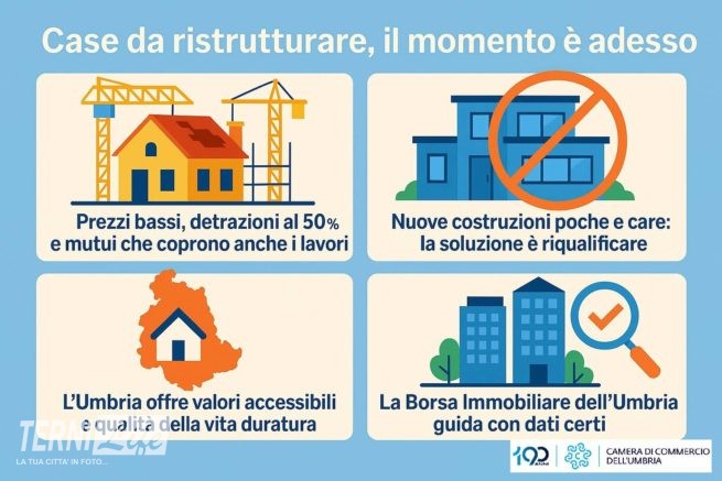 Prezzi bassi, detrazioni al 50% e mutui che coprono anche i lavori. Nuove costruzioni poche e molto care: la soluzione è riqualificare. L’Umbria offre valori accessibili e qualità della vita duratura. La Borsa Immobiliare dell’Umbria, organo della Camera di Commercio, è un punto di riferimento certo. Cavadenti Gasperetti: “Chi si muove ora costruisce valore nel tempo”.