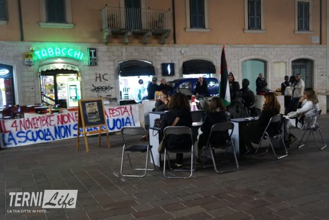 Nel giorno dell’Unità d’Italia e della Festa delle Forze Armate, anche Terni è scesa in piazza per dire no alla guerra e sì alla libertà di pensiero. In Piazza della Repubblica, docenti e studenti hanno organizzato una lezione simbolica all’aperto — con una cattedra e dei banchi — per protestare contro la decisione del Ministero dell’Istruzione e del Merito di annullare il corso “4 novembre, la scuola non si arruola”, promosso dall’Osservatorio contro la militarizzazione delle scuole insieme al Cestes.