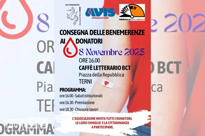 L’Avis Comunale di Terni celebra la generosità e l’impegno dei suoi donatori con una cerimonia di premiazione che si terrà sabato 8 novembre 2025 alle ore 16:00, presso il Caffè Letterario della BCT in Piazza della Repubblica. L’evento, patrocinato dal Comune di Terni, sarà l’occasione per riconoscere il valore di chi, con un gesto semplice ma fondamentale, contribuisce ogni giorno a salvare vite.