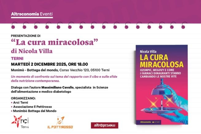 Martedì 2 dicembre 2025 alle ore 18.00 presso Monimbò – Bottega del Mondo (Corso Vecchio 120, Terni) si terrà la presentazione del libro “La cura miracolosa. Ozempic, Wegovy e come i farmaci dimagranti stanno cambiando le nostre vite” di Nicola Villa, edito da Altreconomia. L’incontro rappresenta un’occasione per approfondire uno dei temi più discussi della contemporaneità: il rapporto con il cibo, l’impatto sociale e culturale dei nuovi farmaci dimagranti, e le sfide della nutrizione nell’epoca dell’iperconsumo e della medicalizzazione del benessere. Durante la serata dialogherà con l’autore Massimiliano Cavallo, specialista in Scienze dell’alimentazione e medico diabetologo, per offrire al pubblico una lettura critica e informata su un fenomeno che sta trasformando abitudini, aspettative e narrazioni legate al corpo e alla salute. L’evento è organizzato da: Arci Terni, Associazione “il Pettirosso” e “Monimbo'”