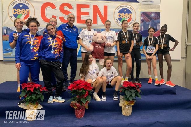 Chiusura d’anno con il trofeo nazionale Csen organizzato ad Ancona dall’Atletica Capanne. Al PalaCasali, al termine di una manifestazione che ha visto tantissimi partecipanti e risultati importanti, arriva il nuovo record regionale della 4×200 Ragazze con il quartetto dell’#iloverun Athletic Terni. Melissa Presti, Michelle Marsili, Emma Capotosti e Sara Bordoni fermano il cronometro sul tempo di 1:59.90, prestazione che migliora il 2:00.60 ottenuto dallo Csain Perugia nel 2022 con Campanile, Tosti, Lucaroni e Lazzari. Le Ragazze si piazzano al terzo posto dietro Asd Pontevecchio Bologna e Atletica Fermo su un totale di 20 squadre partecipanti. Da sottolineare che due componenti della staffetta (Michelle Marsili ed Emma Capotosti) sono addirittura nate nel 2013. Splendida gara anche di Matteo Lysyshyn Fratini nei 600 metri Cadetti che con il tempo di 1:32.09 sale sul terzo gradino del podio insieme al vincitore Michele Begaj (Educare con il Movimento, 1:29.38) e al secondo classificato Manuel Rizzo (Libertas Casarsa, 1:29.76) e sigla il nuovo primato personale. Terza anche Melissa Presti nel Salto in alto categoria Ragazze con la misura di 1.48 e per lei anche un 25esimo posto nei 200 metri in 30.16. Sul podio anche Elena Sozio tra le Cadette che si piazza al terzo posto nei 60 metri (7.97) siglando il terzo tempo regionale di sempre in categoria e il 16esimo crono dell’anno. Per la Sozio anche un ottimo sesto posto nei 200 metri (27.68). In gara anche Gabriele Romiti tra i Ragazzi (32esimo nei 60 metri con il tempo di 8.94 e 30esimo nei 200 metri con 29.41), Sara Bordoni tra le Ragazze (15esima nei 60 metri in 8.78), Michelle Marsili tra le Ragazze (28esima nei 60 metri in 8.95), Emma Capotosti tra le Ragazze (47esima nei 200 metri in 31.59) e Giacomo Maggiora negli Esordienti M10 (47esimo nel Salto in lungo con la misura di 2.61 e 30esimo nei 200 metri in 35.70).