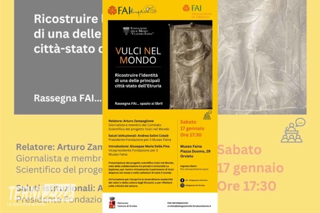 Un’occasione per riscoprire la straordinaria modernità dei valori e della cultura degli Etruschi è quella offerta dall’evento organizzato sabato 17 gennaio al Museo Etrusco ‘Claudio Faina’ di Orvieto, nell’ambito di ‘FAI…spazio ai libri’, rassegna letteraria realizzata in collaborazione con la Delegazione FAI Orvieto e il Gruppo FAI Todi.