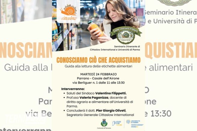 Saper leggere un’etichetta non significa solo conoscere gli ingredienti, ma compiere un atto di responsabilità verso la propria salute e verso l’ambiente. È questo il cuore dell’iniziativa “Conosciamo ciò che acquistiamo – Guida alla lettura delle etichette alimentari”, che si terrà martedì 24 febbraio a Parrano. L’incontro, patrocinato dal Comune e sostenuto dal progetto Food for Future e dal Dipartimento di Giurisprudenza, Studi Politici e Internazionali dell’Università di Parma, rientra nel più ampio progetto “Come costruire il futuro – Cittaslow tra sostenibilità e politiche del cibo”, un seminario itinerante nelle Cittaslow con docenti ed esperti per approfondire le politiche del cibo.