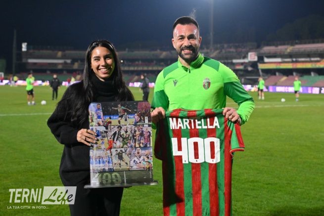 Durante la sfida tra Ternana e Forlì (2-1) valevole per la 28esima giornata di Campionato che si è giocata questa sera, lunedì 23 febbraio, allo Stadio Libero Liberati, il difensore rossoverde Bruno Martella è stato premiato per le sue 400 presenze tra i professionisti. Nel pre-gara, al termine del riscaldamento delle squadre, si è svolta una breve cerimonia con la consegna in campo di una maglia celebrativa da parte della presidente Claudia Rizzo.