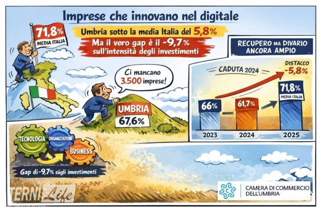 I dati, elaborati dalla Camera di Commercio dell’Umbria sui numeri del Sistema informativo Excelsior di Unioncamere e Ministero del Lavoro, mostrano un recupero rispetto alla caduta del 2024 (quando le imprese digitali umbre erano scese al 61,7%), ma evidenziano ancora un ritardo nella qualità degli investimenti.