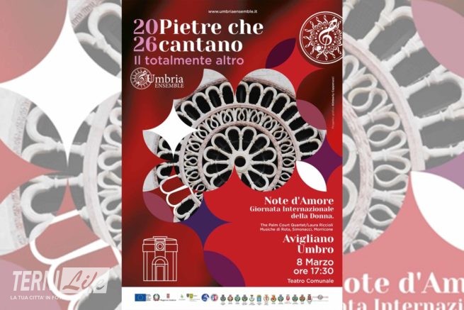 Sarà un concerto speciale quello in programma ad Avigliano Umbro in occasione della Giornata internazionale della Donna dell’8 marzo. Al teatro comunale, alle ore 17.30, si svolgerà “2026 Pietre che cantano – Il totalmente altro”, con Umbria Ensemble. Sarà un concerto dedicato alle donne, tra musica e suggestioni, con il Palm Court Quartet e Laura Riccioli. In programma musiche di Rota, Simonacci e Morricone. “Un momento di cultura e condivisione per celebrare insieme questa giornata”, dicono dal Comune.