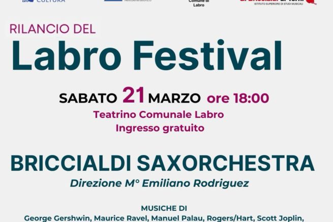 Si comincia sabato 21 marzo alle ore 18 al Teatrino Comunale di Labro, nell’ambito del rilancio del Labro Festival, con il concerto della Briccialdi Saxorchestra, formazione composta esclusivamente da sassofoni e diretta dal M° Emiliano Rodriguez, docente di sassofono del Conservatorio ternano.