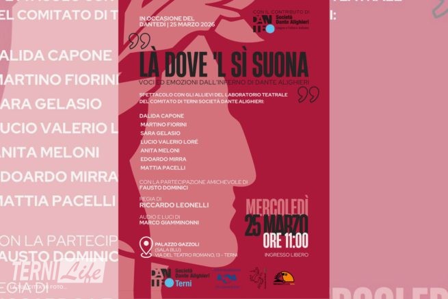 In occasione del Dantedì, mercoledì 25 marzo alle ore 11, il Comitato di Terni della Società Dante Alighieri celebra Dante Alighieri con lo spettacolo teatrale “Là dove ‘l si suona – voci ed emozioni dall’Inferno di Dante Alighieri”, in programma presso Palazzo Gazzoli.