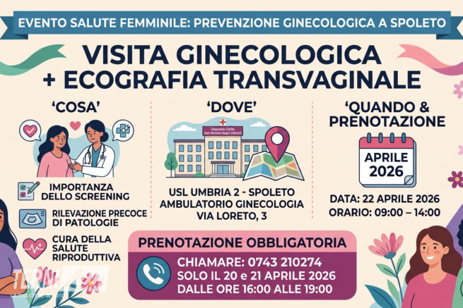 Dal 22 al 29 aprile 2026, gli ospedali di Foligno e Spoleto dell’Azienda Usl Umbria 2 aderiscono all’“Open Week sulla Salute della Donna”, evento promosso dalla Fondazione Onda ETS rivolto a tutte le strutture con Bollino Rosa. La settimana dedicata alla prevenzione offre visite, consulenze, screening e materiale informativo gratuiti per le donne dai 18 anni in su, con l’obiettivo di sensibilizzare sull’importanza della medicina di genere e della prevenzione.