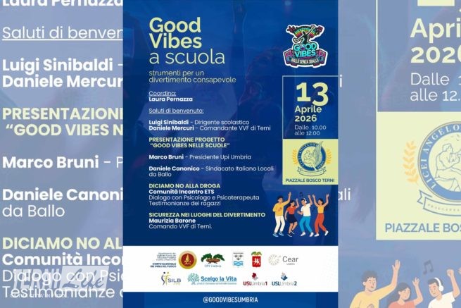 Seguirà il momento di confronto curato dalla Comunità Incontro ETS di Amelia, con psicologo, psicoterapeuta e testimonianze dei ragazzi, per affrontare il tema delle dipendenze e delle scelte consapevoli. L’iniziativa si inserisce nel progetto “Good Vibes”, frutto della sinergia tra Upi Umbria e i partner coinvolti: Corpo Nazionale dei Vigili del Fuoco, Sindacato Italiano Locali da Ballo (SILB-FIPE), Comunità Incontro ETS di Amelia, Usl Umbria 1 e Usl Umbria 2, Province di Terni e Perugia, Scelgo la Vita e Cear Umbria, con l’obiettivo di promuovere tra i giovani una cultura del divertimento più sicura e responsabile.