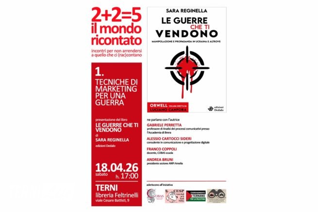 Sabato 18 aprile alle ore 17 la libreria Feltrinelli di Terni ospiterà la presentazione del libro “Le guerre che ti vendono” di Sara Reginella, primo volume pubblicato da Edizioni Dedalo nella collana “Orwell”, diretta da Luciano Canfora.