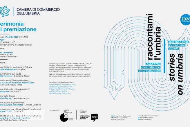 Perugia si prepara a celebrare il giornalismo che sa raccontare il territorio con qualità e profondità. Domani alle ore 12, nella Sala delle Colonne di Palazzo Graziani, si terrà la premiazione della XVI edizione di “Raccontami l’Umbria”, il Premio internazionale promosso dalla Camera di Commercio dell’Umbria e inserito nel programma del Festival Internazionale di Giornalismo.