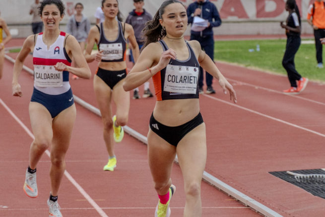 Pass mondiale per Giulia Colarieti al quinto trofeo nazionale Csen organizzato al Santa Giuliana dall’Atletica Capanne, e inserito nel World Global Calendar. L’evento regala grandi risultati e tanti personali per gli atleti del team #iloverun Athletic Terni. Non tradisce le attese Giulia Colarieti nei 1500 nonostante il vento contrario nel rettilineo finale abbia condizionato non poco le gare soprattutto del pomeriggio. Con una bella seconda parte di gara, la Colarieti è scesa sotto lo standard (inferiore a quello di World Athletics) richiesto dalla Fidal per i campionati del mondo di Eugene, negli Stati Uniti, il prossimo 5-9 agosto. “Grande emozione, la gara non si era messa come volevo – commenta Giulia Colarieti – speravo fosse tirata in modo diverso e con temperature diverse, ma proprio in quell’orario si è alzato vento. Spero di migliorare ancora, per ora ho fatto il minimo e superato il primo ostacolo. Da qui a qualificarsi bisogna dimostrare di stare in forma ai campionati italiani”. Il 4:22.82 di Colarieti vale anche il primato regionale, un secondo in meno rispetto a quanto lei stessa aveva corso lo scorso anno. Alle sue spalle, dopo Livia Calderini seconda, grande miglioramento per Sara Diomedi che con 4:25.49 toglie dieci secondi al personale stabilito quest’inverno ai campionati italiani promesse. Si migliora anche Sofia Marcucci che chiude in 4:36.84 al quinto posto. Vincono anche Elena Sozio (80 metri Cadette in 10.53), Olivia Sbordoni (Giavellotto 500 gr Allieve con 36.24), Melissa Presti (Salto in alto Cadette con 1.54 oltre a un 4.02 nel Salto in Lungo). Per Sara Bordoni ottimo tempo nei 300 Cadette (43.99 la migliore delle 2012) e un 10.88 negli 80 corsi due volte per un problema al cronometro. Bene Emma Capotosti nel Peso gomma 2 kg Ragazze (7.14 che vale il quarto posto) e per lei anche un discreto 9.21 nei 60 Ragazze. Jacopo Caricato lascia per una volta il giavellotto e corre i 1000 metri Cadetti in 3:00.73 per un buon sesto posto. Luigi Giacomo D’Angelo è quarto negli 80 Cadetti con 10.10 mentre sale sul podio, terzo, Diego D’Inzillo Carranza negli 800 Uomini con 1:58.71. Nei 1000 metri Ragazze quarta Michelle Marsili con 3:29.35 e quarta anche Ludovica Rosciano nei 400 metri Donne con 59.59. Ottavo Daniel Po negli 800 con 2:01.71. Buoni risultati anche da Benedetta Lepri (8.25 nei 50 metri Esordienti 10 e 3.55 nel Salto in lungo), Francesco Lepri che fa 5,73 nel Salto in lungo Uomini, Lorenzo Mechelli nono con 3.01.54 nei 1000 Cadetti e Timur Nizamov, decimo negli 800 con 2:04.53. Charlotte Gabriele chiude con 10.03 nei 60 Ragazze e 13.64 nei 60 Hs.