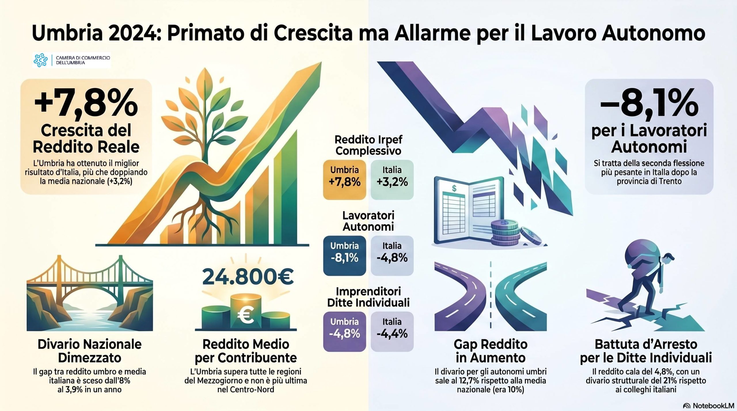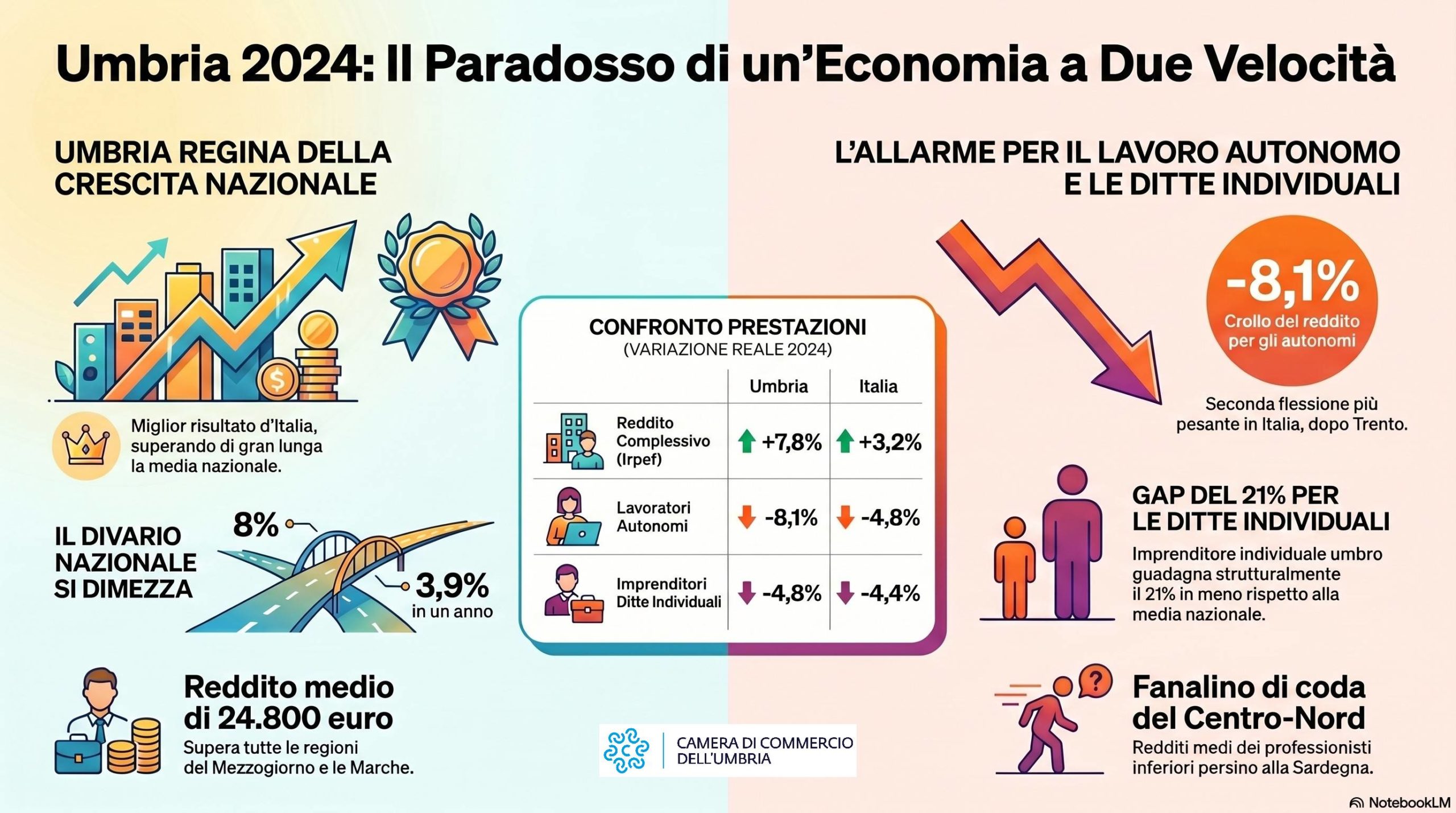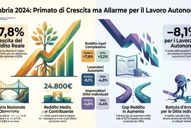 L’Umbria esce quindi dal 2024 con un quadro a due velocità: da un lato una forte crescita media dei redditi e un recupero significativo rispetto all’Italia, dall’altro una fragilità ancora evidente nel tessuto delle piccole imprese e del lavoro autonomo.